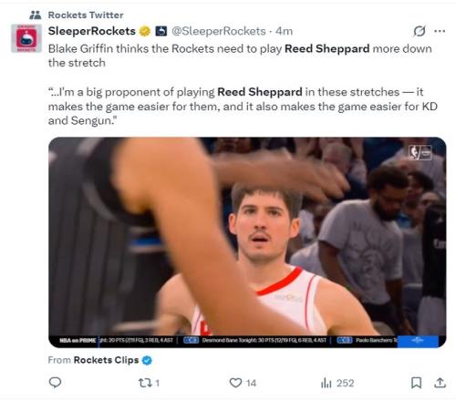 格里芬在直播間談到謝潑德:火箭隊(duì)?wèi)?yīng)該在比賽的決勝時(shí)刻讓謝潑德多登場(chǎng),火箭隊(duì)的進(jìn)攻有申京、杜蘭特、謝潑德時(shí)明顯最出色。