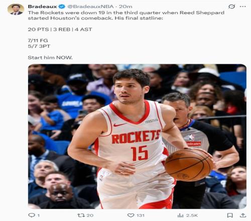 火箭記者蘭德里-賓克利賽后寫(xiě)道:我昨晚跟申京聊天,申京認(rèn)為謝潑德有在比賽時(shí)刻打破僵局的能力,而且申京覺(jué)得他搭檔謝潑德時(shí)球隊(duì)發(fā)揮更出色。