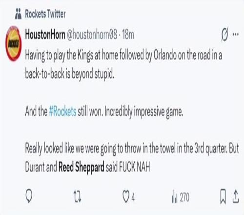休媒:先是幫助火箭擊敗國(guó)王,隨后又客場(chǎng)挑落魔術(shù),NBA的賽程設(shè)置的很不合理,但火箭還是贏球了,第三節(jié)我們就要放棄時(shí),杜蘭特、謝潑德挺身而出說(shuō)NO。