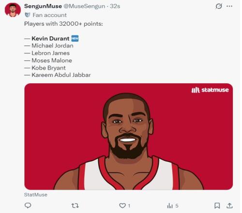 此役后杜蘭特成為NBA歷史上第六位達成32000分的球員,杜蘭特、喬丹、詹姆斯、馬龍、科比、天勾賈巴爾。當然,他也是現役第二位達到32000分的球員。
