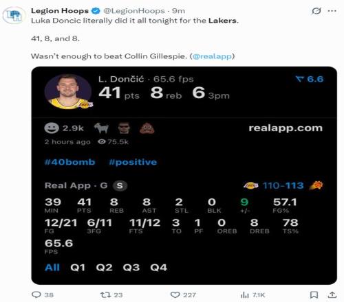 美媒曬出東契奇此役39分鐘,21中12,三分11中6,拿到41分8籃板8助攻2搶斷,命中率57.1%的數(shù)據(jù)寫道,還不足以擊敗吉萊斯皮。
