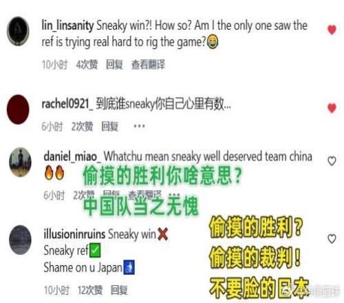 大批中國球迷涌入了評論區,給FIBA世界籃聯留言怒懟:“到底誰偷偷摸摸你自己心里有數。”、“偷摸的勝利你什么意思?中國隊當之無愧。”、“不是偷摸的勝利,而是偷摸的裁判。”,“偷摸的勝利?偷摸的裁判!不要臉的日本!”
