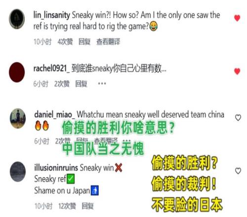 可以看到網(wǎng)友們的回復(fù)直接:“這是偷來(lái)的勝利嗎?我只看到了這是一個(gè)真正的勝利。”后面網(wǎng)友評(píng)論:“中國(guó)隊(duì)贏的問(wèn)心無(wú)愧。”、“偷來(lái)的勝利?不,偷來(lái)的裁判!”、“日本隊(duì)不要臉面,到底誰(shuí)才是小偷,你自己心里清楚。”、“看過(guò)這場(chǎng)比賽都知道,中國(guó)隊(duì)從日本和裁判手里搶走了勝利,這才符合實(shí)際情況。”、“你們安排了三個(gè)裁判,8打5都打不過(guò),所以才氣急敗壞了嗎?”