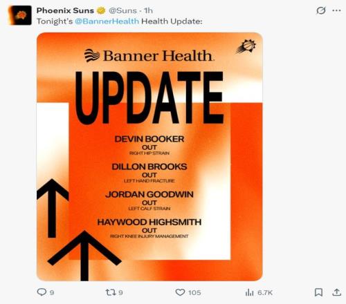 太陽(yáng)這邊布克、狄龍、古德溫、海史密斯都無(wú)法登場(chǎng)。