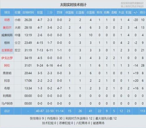 湖人替補僅得25分,太陽替補轟下56分,其中格雷森-阿倫獨得28分6助攻,一個人摧毀了湖人板凳席。太陽榜眼杰倫-格林手感冰涼:投籃15中4,三分7中1,僅得9分3籃板1助攻1搶斷4失誤。最近4場比賽,格林三分球合計33中5!
