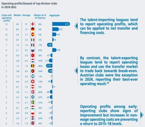 報告指出,人才引進型聯賽往往盈利,這些利潤可用于支付凈轉會費和融資成本。相比之下,人才輸出型聯賽往往運營虧損,并利用球員買賣以期實現收支平衡。