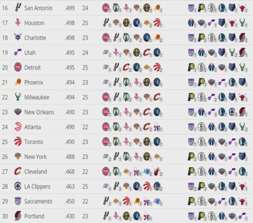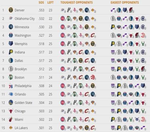 截至今天賽前,雄鹿26勝31負(fù)排名東部第11,落后第10的黃蜂1個勝場,落后第9的老鷹1.5個勝場。下面這張圖是聯(lián)盟剩余賽程的難度:掘金、雷霆、森林狼、奇才和灰熊排名前五。雄鹿僅排聯(lián)盟第22,剩余賽程算是比較輕松的。