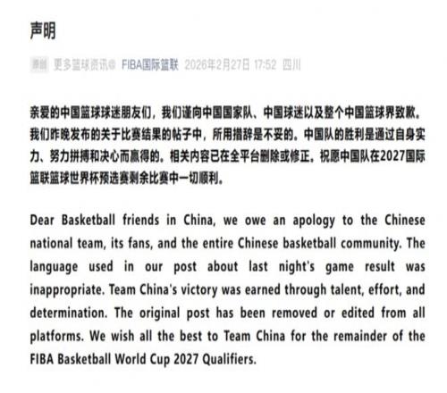 親愛的中國籃球球迷朋友們,我們謹向中國國家隊、中國球迷以及整個中國籃球界致歉。我們昨晚發布的關于比賽結果的帖子中,所用措辭是不妥的。中國隊的勝利是通過自身實力、努力拼搏和決心而贏得的。相關內容已在全平臺刪除或修正。祝愿中國隊在2027國際籃聯籃球世界杯預選賽剩余比賽中一切順利。