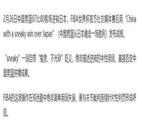 整句話翻譯過來,就是“中國男籃從日本偷走一場勝利”。