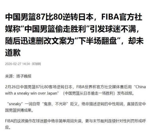 國際男聯稱“中國男籃偷走勝利”。