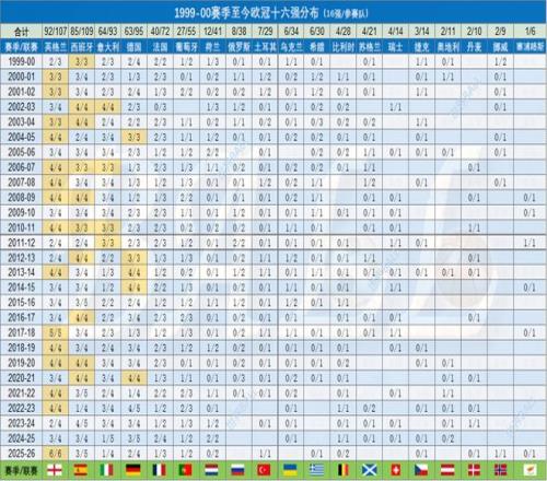 1、1999-03四個賽季,其實并不設置“十六強”這樣的概念,而是32強經過第一階段小組賽,篩選出16支球隊進入第二階段小組賽。為便于統計,將進入第二階段的球隊視同進入十六強。