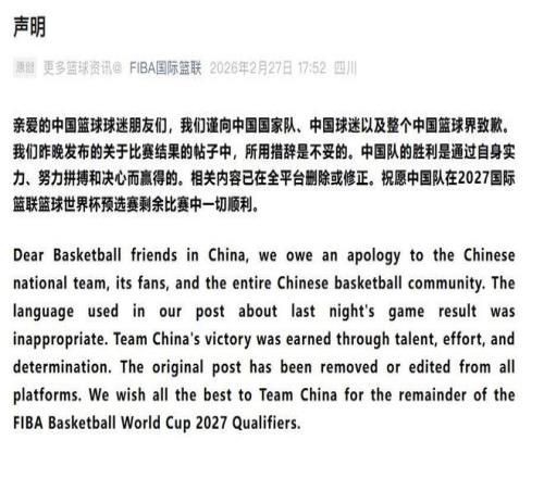 今天,F(xiàn)IBA國際籃聯(lián)官方終于頂不住壓力,發(fā)表聲明,因昨日中國男籃戰(zhàn)勝日本男籃的比賽結(jié)果帖子中的措辭不當(dāng),而向中國男籃、中國球迷以及整個(gè)中國籃球界致歉,以下為原文: