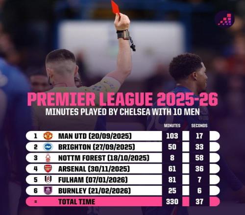 切爾西本賽季英超十人作戰累計330分37秒,為所有球隊最多 懂球帝 2026-02-27 22:11:43 由于本賽季領到了6張紅牌,切爾西在英超聯賽中十人作戰累計時長為330分鐘37秒,為所有球隊最多。據Opta統計,由于在2025-26賽季已經吃到6張紅牌,切爾西在本賽季英超中有330分37秒的時間是在少打一人的情況下進行的(包括所有補時)。這一時長是聯賽所有球隊中最多的,占到了他們整個賽季比賽時間的12.1%。【上咪咕獨家看英超】英超免費觀看_紅牌免費觀看_切爾西隊免費觀看_英超高清在線_紅牌高清在線_切爾西隊高清在線 英超 紅牌 切爾西隊 英超聯賽 歐冠淘汰賽附加賽 上一篇: 歐協聯18決賽對陣:水晶宮vs拉納卡,佛羅倫薩vs琴斯托霍瓦 下一篇: 斯洛特:抽中加拉塔薩雷是預想中的結果,此番客戰需更好表現
