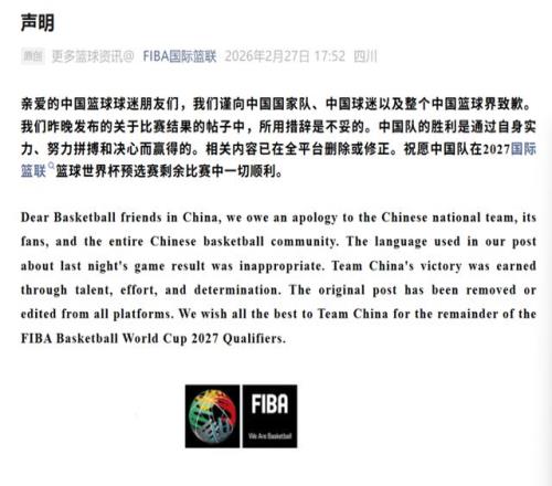 2月26日中國男籃在沖繩客場87比80逆轉日本隊后,FIBA籃球世界杯官方社媒賬號在戰報里寫下“China with a sneaky win over Japan”(“sneaky”在英語里帶著“鬼鬼祟祟、不光彩”的暗示,多家媒體譯作“偷走一場勝利”),隨即引發輿情。相關帖文隨后被刪除;2月27日,FIBA在其官方微信發布中英雙語致歉,明確向中國國家隊、中國球迷以及中國籃球界致歉,承認措辭不妥,并強調中國隊勝利來自實力、拼搏與決心。
