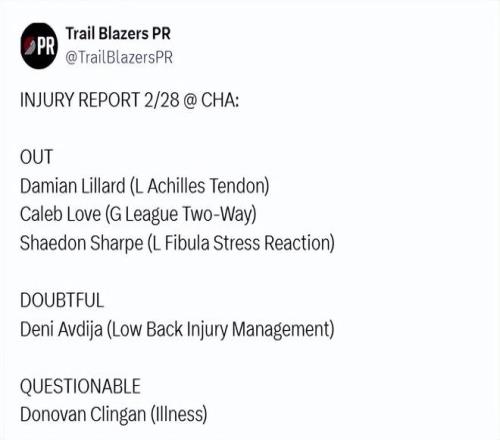 開拓者最新的傷病名單顯示,明日對(duì)陣黃蜂,利拉德、樂福、夏普是缺陣狀態(tài),阿夫迪亞因背部傷病管理大概率也不打,生病的克林根出戰(zhàn)成疑。楊瀚森和羅威都不在傷病名單中。羅威上一場(chǎng)比賽得到14分14籃板2搶斷4蓋帽的全面數(shù)據(jù),瀚森DNP,沒有獲得出場(chǎng)機(jī)會(huì)。