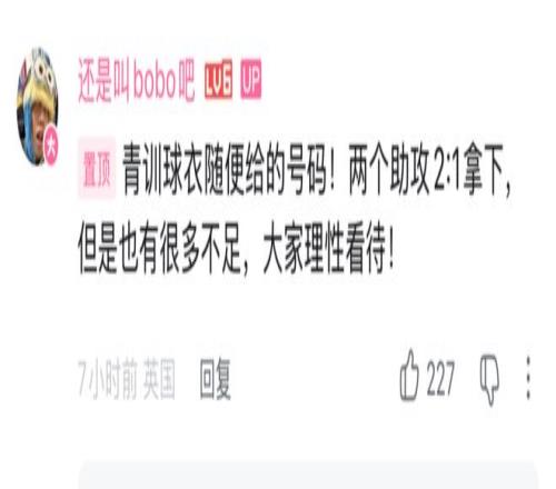 根據博主“還是叫bobo吧”的透露,徐彬本場身披10號球衣登場。需要說明的是,青訓梯隊球衣號碼并無固定分配,10號為隨機發放。