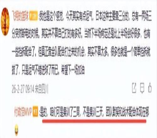 付政浩 認為,中國隊下半場之所以能夠逆轉日本隊,賀希寧和趙繼偉的三分球起了關鍵作用,他在與球迷互動中充分肯定了賀希寧、趙繼偉、廖三寧、胡金秋和朱俊龍的作用,稱他們是取勝的五大功臣。他直言賀希寧真的是夠拼,就得多用這種有能力敢拼敢打的選手。