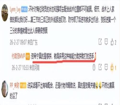 可是上半場賀希寧僅打了7分鐘,而表現一般的王浩然、李弘權和毫不中用一分不得,數據掛0的張鎮麟打得時間都比賀希寧多,這三人上半分別打了9分鐘、10分鐘和8分鐘, 這也是上半場落后的一個原因。郭士強給賀希寧的戰術地位并不高,半場僅有2次球權,而張鎮麟有3次球權、李弘權有4次球權,他們的球權都比賀希寧多。這也是付政浩提出好好復盤的原因,希望以后的比賽中重用賀希寧這種有能力敢拼敢打的選手。從付政浩的評價來看,他認為有能力敢拼敢打的選手有5人,那就是賀希寧、趙繼偉、廖三寧、胡金秋和朱俊龍,他希望要重用這些人。你們說呢?