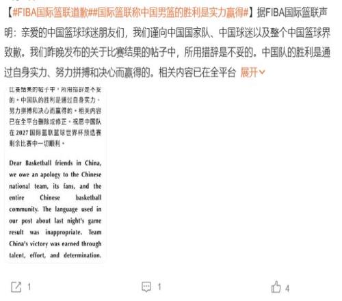 而在昨天晚上,國際籃聯再次向中國男籃、球迷進行了一次隆重的道歉。不過,國際籃聯道歉的真實原因并非裁判的爭議執法,而是他們自身的用詞錯誤。這一道歉,顯然難以讓中國球迷接受。