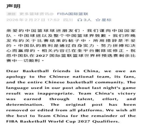 不僅如此,FIBA官方還發布聲明,表示在中國男籃戰勝日本男籃的比賽結果帖子中的措辭不當,而向中國男籃、中國球迷以及整個中國籃球界致歉。這則道歉聲明使用了中英雙語,不僅通過中文官方發出,還在引起誤會的Instagram官方賽果帖的評論區同步了道歉的內容。這樣來看的話,FIBA的道歉還是非常有誠意的。只是希望在以后的比賽中,FIBA官方也能要求裁判做到公平公正,不要再那么明顯針對中國男籃了。