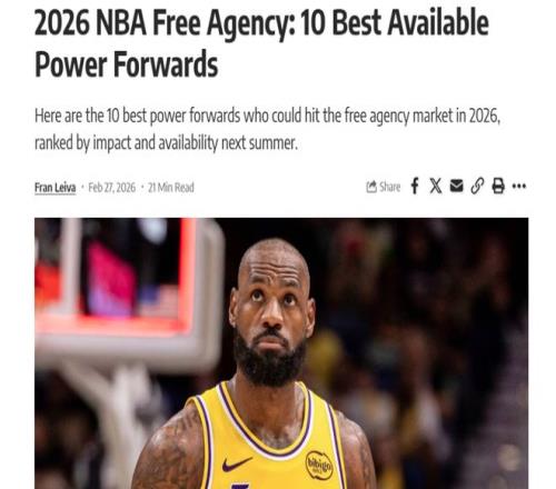 在常規(guī)賽進入沖刺階段,強弱球隊明顯分化之際,美媒《fadeawayworld》提前評選出26年自由市場值得關注的TOP10前鋒,其中火箭伊森第7名,41歲詹姆斯仍排第一。