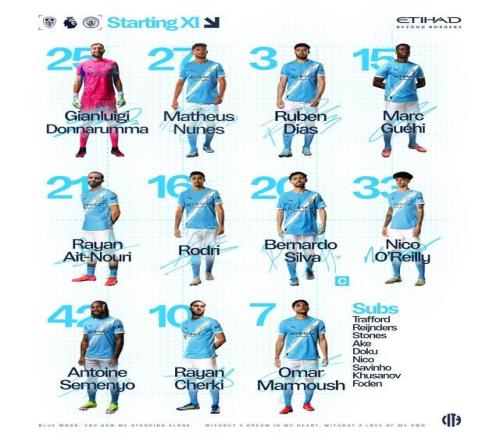 曼城首發:25-多納魯馬、21-努里、15-格伊、3-魯本-迪亞斯、27-努內斯、16-羅德里、33-奧賴利、20-席爾瓦、10-謝爾基、7-馬爾穆什、42-塞門約