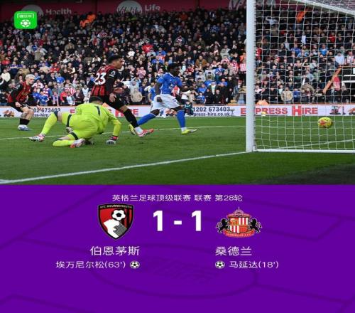 北京時間2月28日英格蘭足球頂級聯賽第28輪,伯恩茅斯主場對陣桑德蘭。伯恩茅斯埃萬尼爾松破門。桑德蘭馬延達破門。最終比分伯恩茅斯1-1桑德蘭。