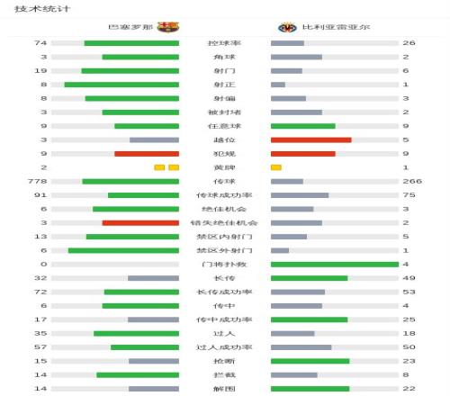 第4分鐘,比利亞雷亞爾球員投訴巴薩禁區內手球,裁判表示沒有問題
