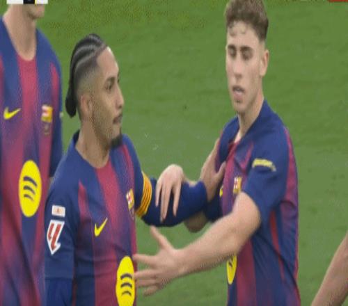 第57分鐘,亞馬爾倒地后黃潛發動進攻,雙方教練爭吵染黃,拉菲尼亞也吃黃