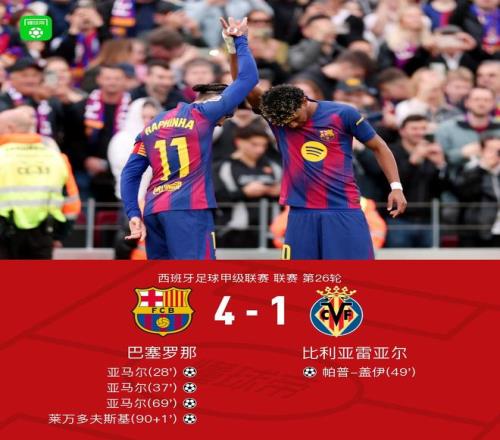 北京時間2月28日西班牙足球甲級聯賽 聯賽 第26輪,巴塞羅那主場對陣比利亞雷亞爾。上半場費爾明搶斷后直塞,亞馬爾單刀推射破門,之后費爾明傳球,亞馬爾強行突入禁區兜射破門。下半場帕普-蓋伊亂戰破門扳回一球,之后佩德里精準直塞,亞馬爾單刀破門生涯首次戴帽,補時階段佩德里直塞,孔德助攻萊萬打空門得手。最終巴薩4-1戰勝比利亞雷亞爾。