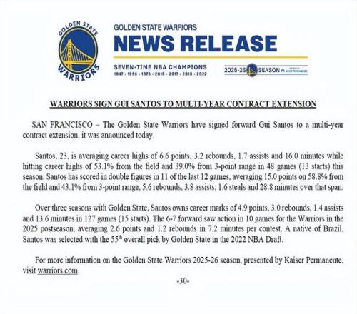 北京時間3月1日,勇士官方宣布,三年級前鋒桑托斯已經(jīng)與球隊簽下一份多年續(xù)約合同。據(jù)名記Shams報道,桑托斯簽下的是一份3年1500萬美元的續(xù)約合同,其中包含2028-29賽季球員選項。