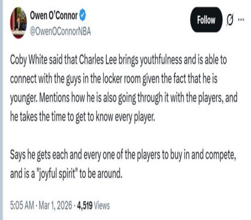 替補奇兵懷特則稱贊了主帥查爾斯-李:“他很年輕,能夠在更衣室與球員們打成一片,他能做到和球員們感同身受,會花時間去了解每一個人,這讓所有人都全心投入、全力競爭,整個團隊都充滿積極快樂的氛圍。”