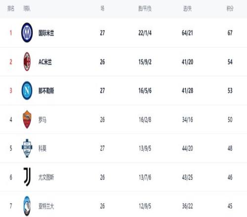 在積分榜上,國際米蘭以絕對優(yōu)勢占據(jù)榜首位置。國際米蘭22勝1平4負,拿到67分。而排名第2的AC米蘭只拿到54分,足足落后國際米蘭13分。這樣的差距太驚人了。顯然,國際米蘭已經(jīng)無限接近冠軍了。那不勒斯贏球之后,總積分達到53分,排名第3。第4的是羅馬,拿到50分??颇A球之后,總積分達到48分,超越了尤文圖斯,升到第5名。而只拿到46分的尤文圖斯掉到第6名。