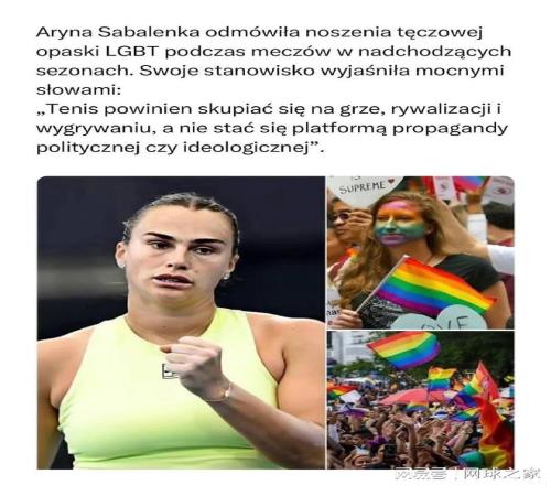 近日,一則帖子在外網瘋狂傳播。帖主聲稱,阿琳娜·薩巴倫卡已“拒絕在未來賽季的比賽中佩戴LGBT彩虹手環”,并配以強硬的言辭闡述其立場:“網球應該專注于比賽、競爭與勝利,而不是成為政治或意識形態宣傳的平臺?!?/p>