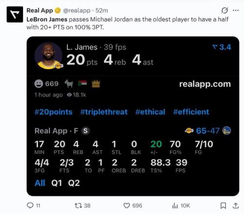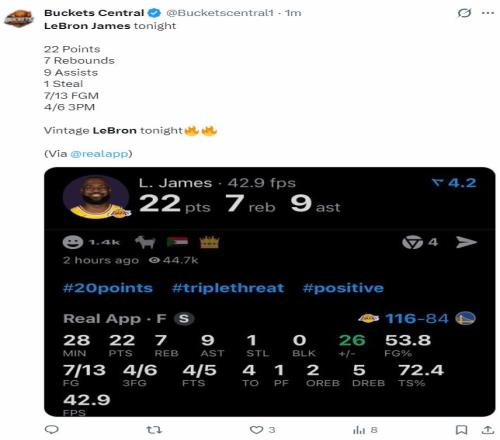 但實際上詹姆斯在湖人116-84領先勇士后就被換下場,全場比賽28分鐘,13中7,三分6中4,罰球5中4,拿到22分9助攻7籃板1搶斷,命中率53.8%,三分命中率80%,真實命中率72.4%,正負值+26。