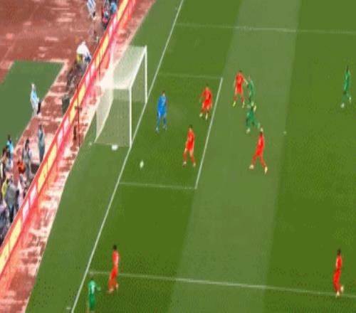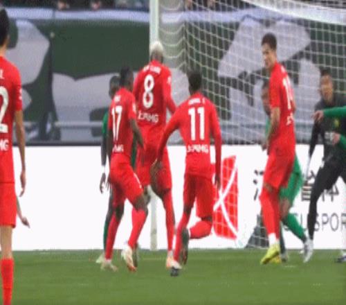 第29分鐘,楊希右路橫傳,安永佳將球一擋,達萬大腳解圍,球打在恩科洛洛身上反彈擊中門柱,國安逃過一劫。