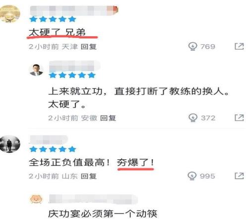 本場比賽,24歲的李弘權替補出戰近28分鐘,6投3中貢獻9分11籃板,其中包括4個前場籃板。數據顯示,當他在場時,男籃凈勝對手21分,正負值全隊第一,而且是全隊斷層式領先,是男籃逆轉取勝的奇兵。球迷直言:“太硬了”、“慶功宴必須第一個動筷”。