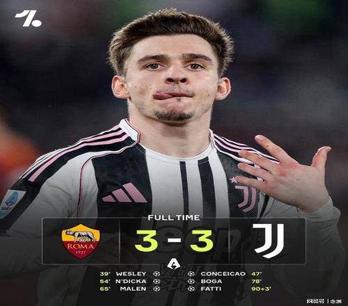 意甲第27輪,羅馬主場(chǎng)3-3戰(zhàn)平尤文,51分第四,尤文47分第六。韋斯利先拔頭籌,小孔塞桑超級(jí)世界波,恩迪卡建功,馬倫單刀破門(mén)加盟后7場(chǎng)6球,博加替補(bǔ)破門(mén),加蒂替補(bǔ)絕平。