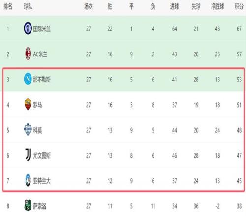 在這一夜,除了羅馬和尤文戰平之外,亞特蘭大也沒能拿到3分,他們在客場1-2輸給了薩索洛,無緣取得4連勝。由于意甲3強連續不勝,爭四的格局也更加混亂。截至目前,從第三的那不勒斯,到第七的亞特蘭大,這5支球隊就差了8分,他們當中最后很可能只有2隊能拿到歐冠席位。盡管那不勒斯和羅馬現在有積分優勢,但是身后的對手都對前四虎視眈眈,在最后的11輪比賽中,還有很大的變數。