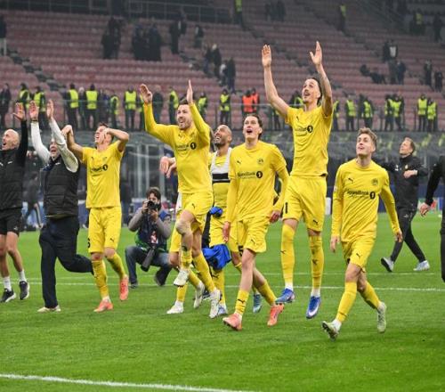 2月24日,博德閃耀隊球員在本賽季歐冠淘汰賽附加賽戰勝國際米蘭隊后慶祝。新華社發