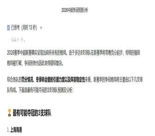 Deepseek認為,上港僅被扣5分,追分壓力較小,球隊陣容穩定且補強得當,同時開局階段對手實力補強,賽程相對友好。因此,他們成為最有可能奪冠的球隊。