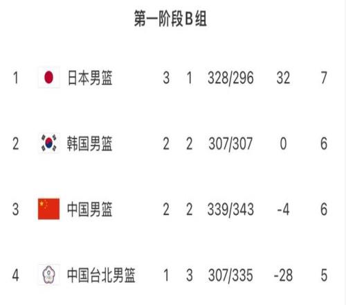 中國男籃先后逆轉日本隊和中國臺北隊,拿到4分的積分;加上開局階段被韓國隊雙殺,拿到2分,中國男籃4場比賽的最終積分為6分。韓國隊同樣為6分。
