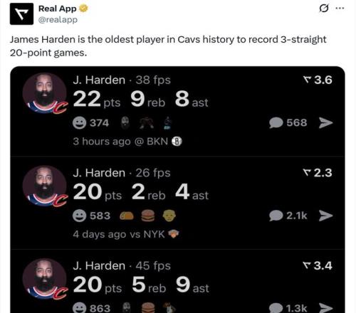 憑借這樣的表現,哈登一口氣刷新數項紀錄,首先是36歲188天的哈登已經連續三場交出20+得分表現,創造騎士隊史最老紀錄。