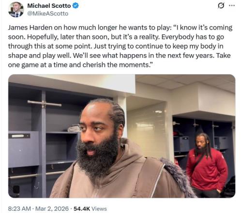 盡管狀態不俗,但已經年滿36歲的哈登賽后還是難免被問到退役問題,哈登公開表示:“我知道離退役的日子越來越近了,希望這一天能晚一些,自己會努力保持身體狀態,一場一場地打,珍惜當下的每一刻?!?/p>