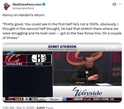 正如阿特金森所說,本場傷愈復出的哈登低開高走,全場出戰36分鐘,9中5,三分7中4,罰球12中8高效拿下22分9板8助全能數據。
