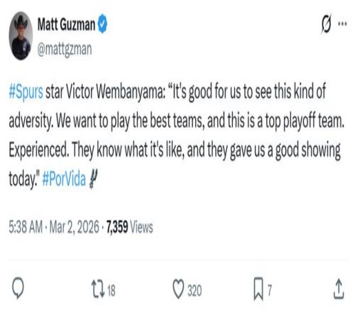 除此之外,馬刺隊本場三分線外也失準,34次出手僅命中9球,其中文班更是三分7投僅1中。