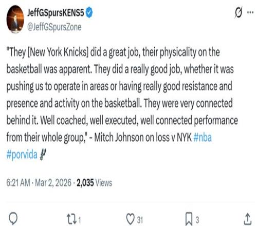 賽后馬刺主帥米奇也稱贊道:“本場他們表現出色,進攻端身體對抗強度極高,迫使我們不得不改變防守策略,防守端也展現出極強的韌性、存在感與積極性,總而言之,他們攻防做得都非常出色,團隊配合默契,這是一場訓練有素、執行到位、配合默契的精彩比賽。”