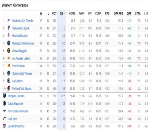 最新的西部排名:雷霆、馬刺、火箭、森林狼、掘金、湖人、太陽、勇士、快船、開拓者、灰熊、獨行俠、鵜鶘、爵士、國王。