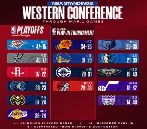 北京時間3月2日對于NBA來說是大比賽日,多場西部的比賽對西部的格局又出現了一些影響,比如森林狼擊敗掘金后已經豪取三連勝排名也升至西部第四,火箭還是西部第三,快船擊敗鵜鶘后再度升到西部第九。