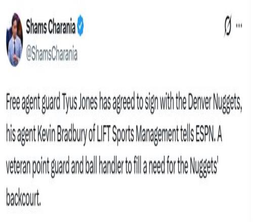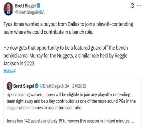 名記Siegel跟進(jìn)報(bào)道稱,瓊斯與獨(dú)行俠達(dá)成買斷,是想加盟一支具備季后賽競爭力的球隊(duì),并在球隊(duì)中擔(dān)任替補(bǔ)貢獻(xiàn)者。如今他得到了這樣的機(jī)會 —— 將在掘金擔(dān)任賈馬爾-穆雷身后的主要替補(bǔ)后衛(wèi),這與2023年雷吉-杰克遜在掘金的角色相似。